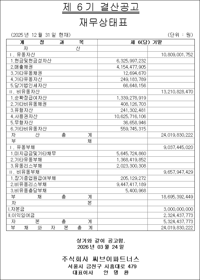 주식회사 씨브이파트너스 제6기 결산공고